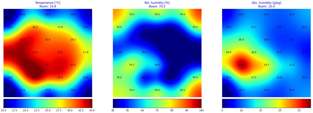 T (°C), RH (%), AH (g/kg), HI (°C) = „gefühlte“ T, Zeit, sowie thermodynamische Kennzahlen der definierten Standardbedingungen.